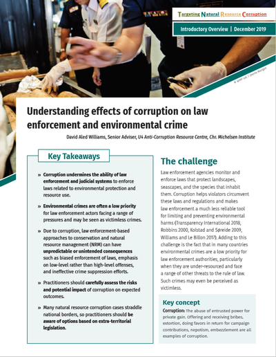 Law enforcement agencies monitor and enforce laws that protect landscapes, seascapes, and the species that inhabit them. Corruption helps violators circumvent these laws and regulations and makes law enforcement a much less reliable tool for limiting and preventing environmental harms (Transparency International 2018, Robbins 2000, Kolstad and Søreide 2009, Williams and Le Billon 2017). Adding to this challenge is the fact that in many countries environmental crimes are a low priority for law enforcement authorities, particularly when they are under-resourced and face a range of other threats to the rule of law. Such crimes may even be perceived as victimless.