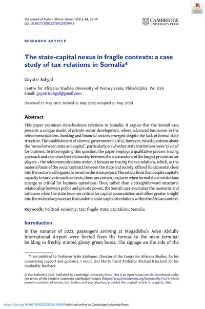 This paper examines state-business relations in Somalia. It argues that the Somali case presents a unique model of private sector development, where advanced businesses in the telecommunications, banking and financial sectors emerged despite the lack of formal state structure. The establishment of a formal government in 2012, however, raised questions about the ‘nexus between state and capital’, particularly on whether state institutions were ‘pivotal’ for business. In interrogating this question, the paper employs a qualitative process tracing approach and examines the relationship between the state and one of the largest private sector players – the telecommunications sector. It focuses on tracing the tax relations, which, as the material basis of the social contract between the state and society, offered fundamental clues into the sector’s willingness to invest in the state project. The article finds that despite capital’s capacity to survive in such contexts, there are certain junctures when formal state institutions emerge as critical for business operations. Thus, rather than a straightforward structural relationship between public and private power, the Somali case explicates the moments and instances when the state becomes critical for capital accumulation and offers greater insight into the molecular processes that underlie state-capitalist relations within the African context.