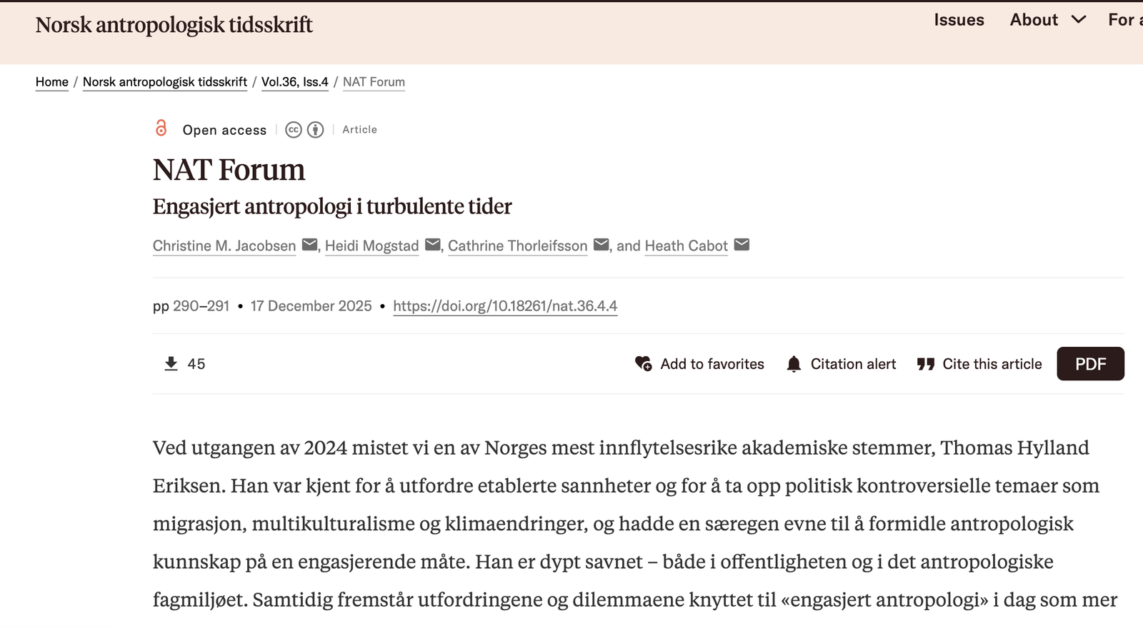 Ved utgangen av 2024 mistet vi en av Norges mest innflytelsesrike akademiske stemmer, Thomas Hylland Eriksen. Han var kjent for å utfordre etablerte sannheter og for å ta opp politisk kontroversielle temaer som migrasjon, multikulturalisme og klimaendringer, og hadde en særegen evne til å formidle antropologisk kunnskap på en engasjerende måte. Han er dypt savnet – både i offentligheten og i det antropologiske fagmiljøet. Samtidig fremstår utfordringene og dilemmaene knyttet til «engasjert antropologi» i dag som mer presserende enn noen gang. Flere av våre kolleger i USA, Europa og andre steder har blitt utsatt for sanksjoner, undertrykkelse av akademisk frihet og institusjonelle restriksjoner på grunn av sine offentlige engasjement – særlig i forbindelse med kritikk av Israels pågående og folkerettsstridige angrep på Gaza. Parallelt med dette bygges etablerte forskningsfelt innen antropologi, som migrasjon og kjønn, ned og anklages for å være ideologiske og politiserte.