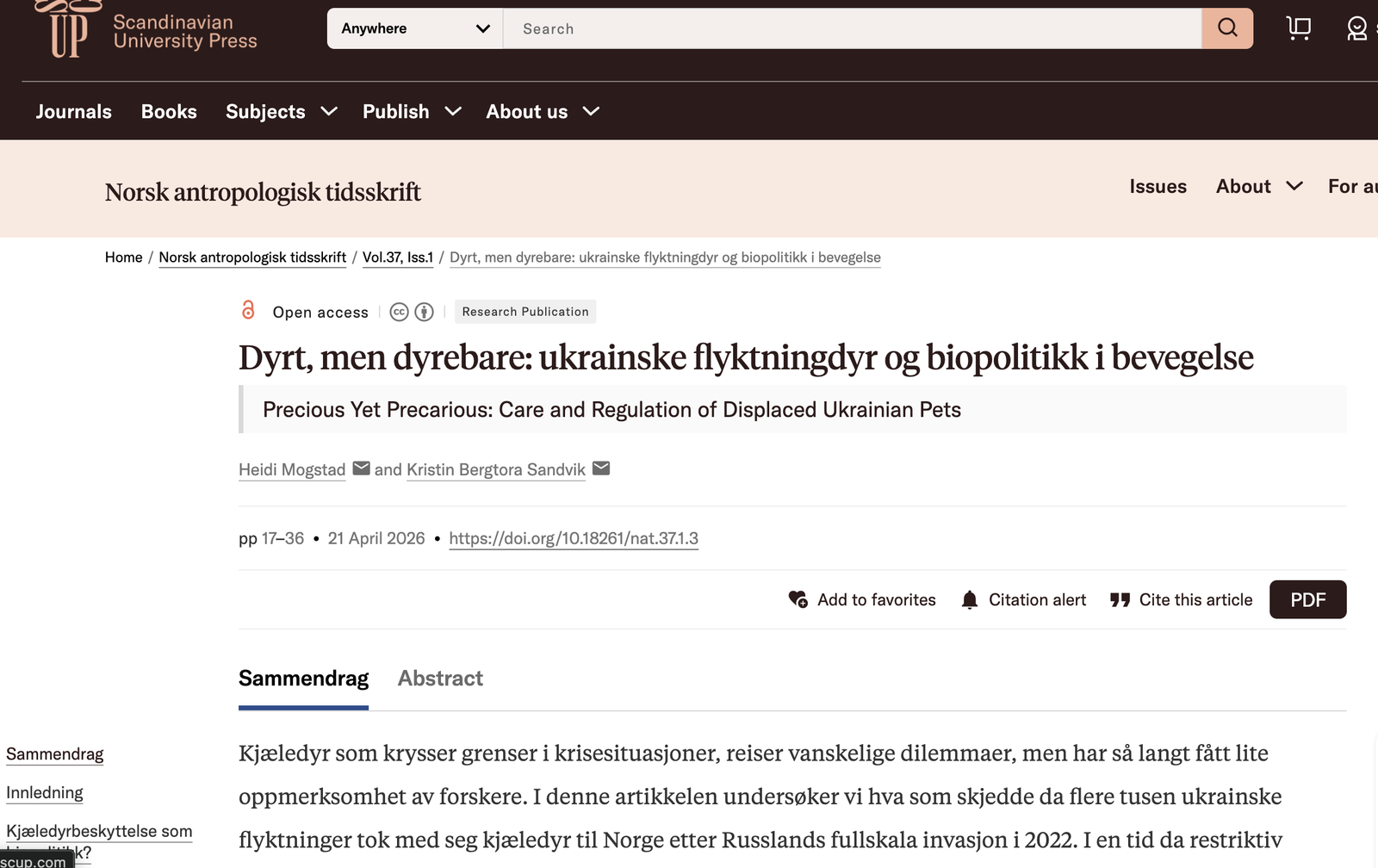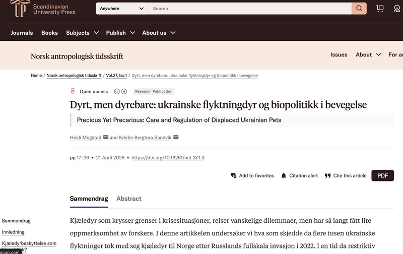 Kjæledyr som krysser grenser i krisesituasjoner, reiser vanskelige dilemmaer, men har så langt fått lite oppmerksomhet av forskere. I denne artikkelen undersøker vi hva som skjedde da flere tusen ukrainske flyktninger tok med seg kjæledyr til Norge etter Russlands fullskala invasjon i 2022. I en tid da restriktiv flyktningpolitikk og velferdsnasjonalisme dominerer den europeiske agendaen, har norske myndigheter gjort flere unntak fra gjeldende importregelverk og investert, sammen med dyrevelferdsorganisasjoner og frivillige, betydelige tid og ressurser i å ivareta disse dyrene. Vi utforsker hva som motiverte denne politikken, og hvorfor unntakene senere ble avviklet. Vi viser at statlige aktører primært var opptatt av biosikkerhet og grensekontroll, samtidig som kjæledyrs økende sosiale status og nordmenns empati med ukrainske flyktninger også påvirket aktørenes støtte og innstilling. Flyktningdyrene var dessuten ikke bare passive objekter for kontroll og omsorg, men utøvde en særegen emosjonell kraft som påvirket menneskelige holdninger og politiske beslutninger. Ved å løfte frem disse parallelle forklaringene gir vi med artikkelen et nyansert, etnografisk bidrag til forståelsen av Europas håndtering av ukrainske flyktninger og deres kjæledyr. Vi belyser også særtrekk ved den norske velferdsstaten og bidrar til bredere debatter om flyktningbeskyttelse og forholdet mellom mennesker og dyr i en «planetarisk» tidsalder.